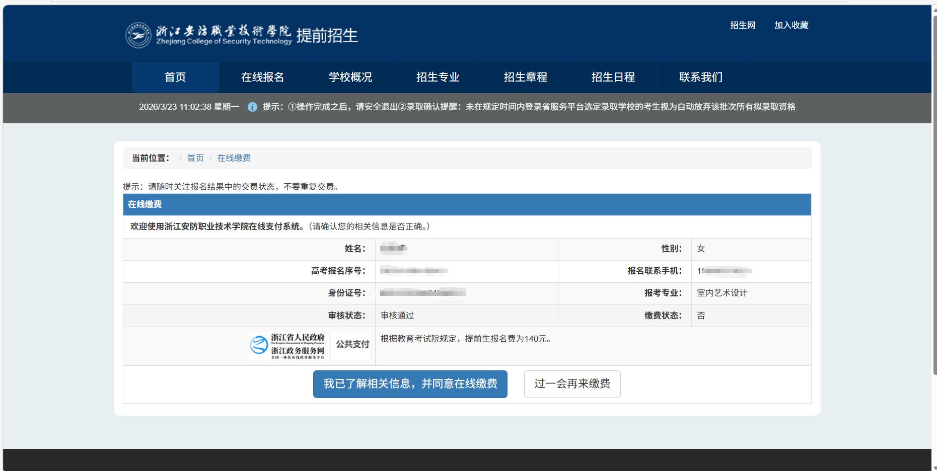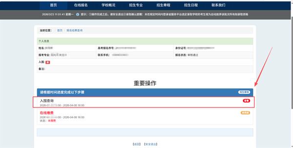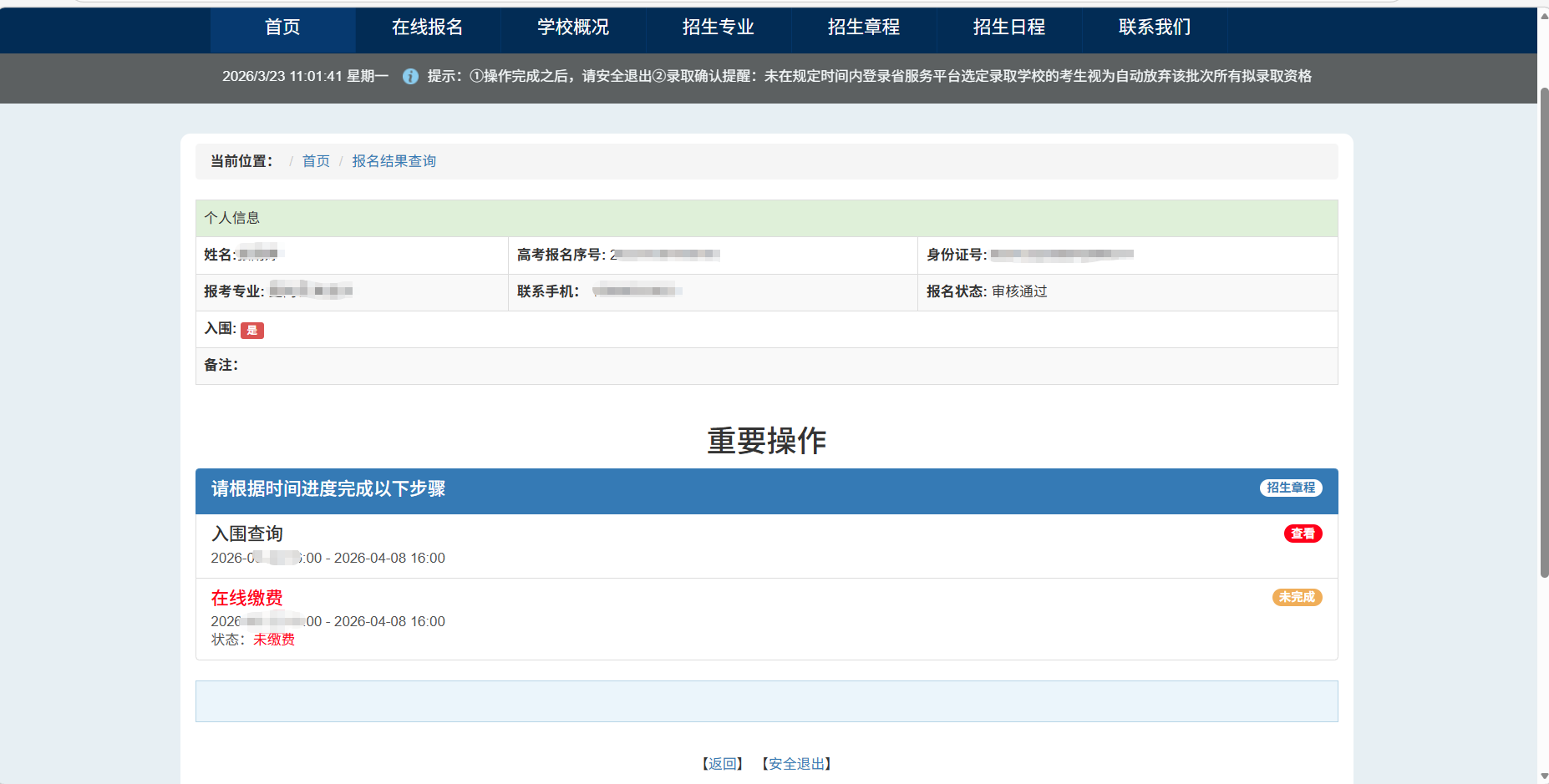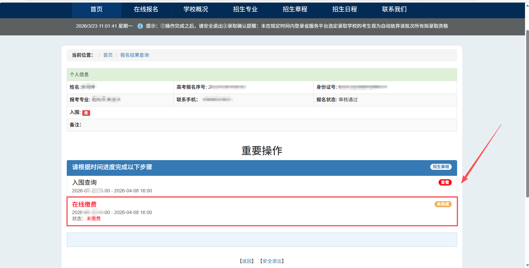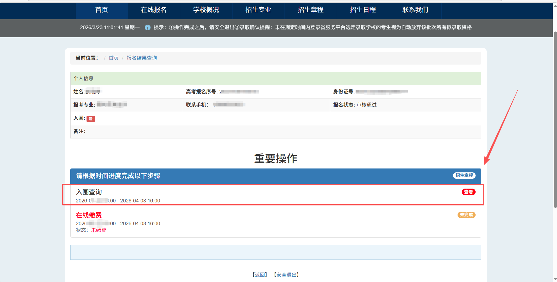 3月23日16:00后,考生可登录我校招生网,自行查询入围情况,并于3月23日—4月8日16:00,进入系统完成报名考试费的缴纳。未按时缴费的考生视为自动放弃,请考生及时缴费。